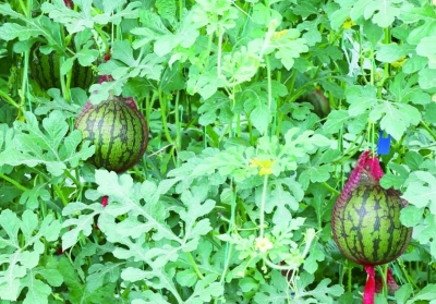 等西瓜长到一斤左右时套上塑料网,并借助绳结吊在半空中,让西瓜充分享受“日光浴”。