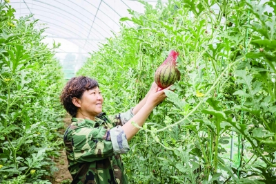 西瓜立体栽培又称吊蔓栽培技术。它将西瓜藤蔓人为牵引朝上生长,等西瓜长到一斤左右时套上塑料网,并借助绳结吊在半空中,从而让西瓜充分享受“日光浴”。“立体栽培技术让西瓜四周通风透光,不像在地上,总有一面不见光。这样既能增加含糖量,也能让顾客有新鲜感,口感好了,回头客多了,密度也大了,经济价值自然就能体现出来。”张雷告诉记者,立体栽培西瓜产量是普通地下爬藤西瓜的两倍,原先一亩地种400株左右,现在可以种1000株以上。