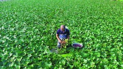 陈店村村民潘昌武穿梭在满塘碧绿中采收菱角。