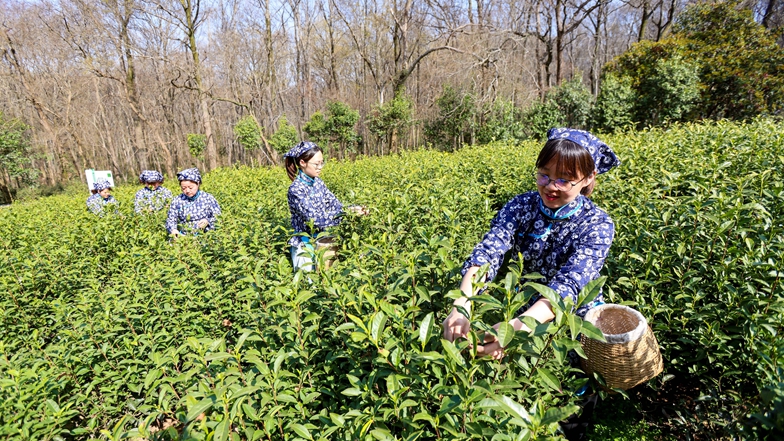 22日,绿意盎然的钟山风景区茶园里,采茶工人在田间细心地采摘枝头上的嫩芽。当日,中山陵茶厂的雨花春茶正式开始采摘。