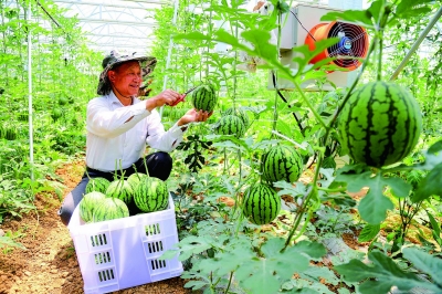 28日,农户正在高淳区桠溪街道的大棚里采收吊蔓种植的“台湾小兰”西瓜。当地为实现农产品提质增效,积极引进新品种、采用新技术,原本长在地上的西瓜,如今都挂在了藤上,立体栽培方式不仅增加光照,还大幅增加了产量。 段仁虎 摄