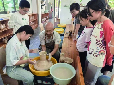 游客在高淳陶瓷博物馆体验陶瓷制作。茹康 摄