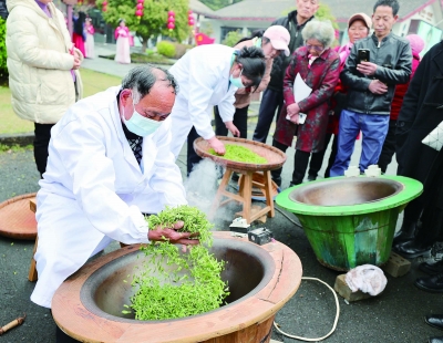 近日,在江宁区黄龙岘南京市第三届采茶节开幕式上,现场炒茶吸引了众多游客的目光。