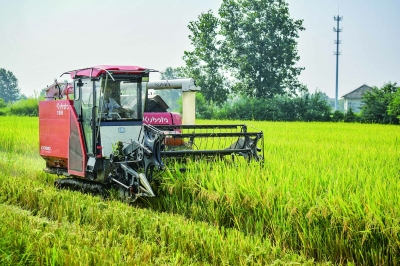六合区竹镇镇龚胜行家庭农场农户正在收割头茬再生稻。董家训 摄