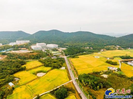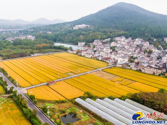 10月17日,航拍江宁区汤山街道古泉社区,金色稻田、乡村道路与村庄、青山相映成景,构成一幅田园丰收画景。