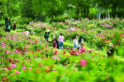 南京玫瑰园各色玫瑰和月季竞相开放,吸引无数市民游客慕名而来。
