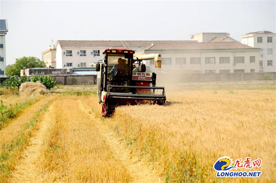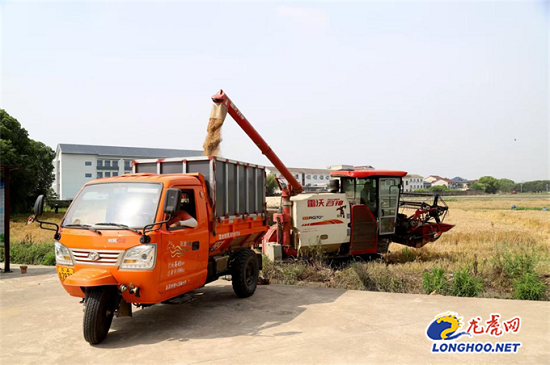 在街道居民蒋华平的家庭农场里,沉甸甸的麦穗摇曳飘香,4台大型联合收割机往返穿梭在金色麦浪中。随着机器轰鸣,一垄垄小麦被卷进机器,收割、脱粒、除杂一气呵成。待收割机“满腹”后,一股股麦流从出粮口倾泻而下,装入麦田旁等待的三轮运输车,蒋华平脸上洋溢着丰收的喜悦。