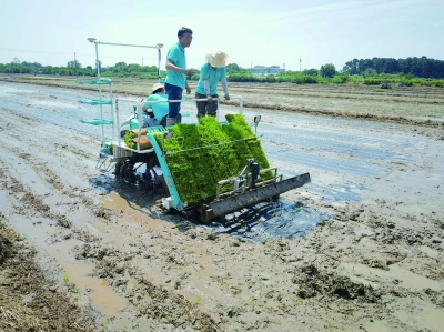 6月6日,市水稻单产提升培训观摩会在高淳区东坝街道举行,一台蓝色的插秧机在田间来回穿梭,机器经过之处不仅插下了绿色的秧苗,还覆上了一层黑色的地膜。