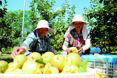 当日,记者在该梨园看到,果农们有的在采摘,有的在装运,一片繁忙景象。据了解,甜梨上市以来,梨园每天组织10多名果农加紧采收并销往市场。