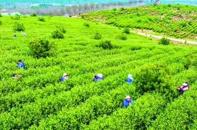 3月17日,溧水区晶桥镇芝山村曹庄富硒茶园绿意盎然,村民正忙碌在茶树间采摘富硒春茶。戚珂嘉 摄