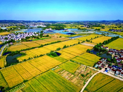 5月13日,桠溪都市现代农业产业示范园区内,大片麦田金黄灿烂,微风拂过,麦浪滚滚,与错落的村舍、清澈的水塘相映成趣,构成如诗画卷。 段仁虎 摄
