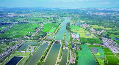 图为尖山翻水站引金牛山水库湖水灌溉稻田。