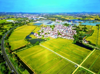 10月9日,高淳区桠溪都市现代农业产业示范园区的金色稻田“丰”景如画。当地4.7万余亩水稻丰收在望,金色田野与美丽乡村构成一幅秋日丰收图景。