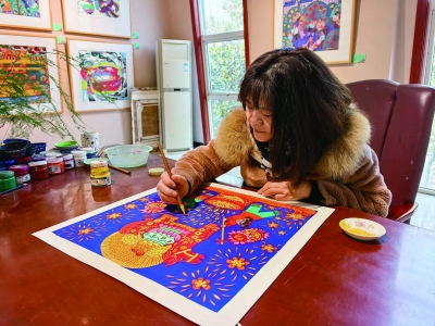 王金凤马不停蹄创作《马年有余》时,另一位农民画家张国良正抓紧赶制《马上有钱》。“钱袋子鼓起来、过上富足生活是老百姓的共同愿望。”张国良一边思考如何着色,一边向记者说道,创作时,自己特意把马画成一个存钱罐造型,一位小朋友源源不断地把钱存放其中,“马上有钱”在画纸上变得更加具象。
